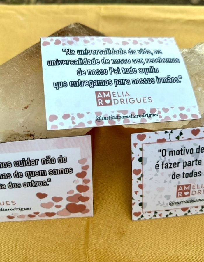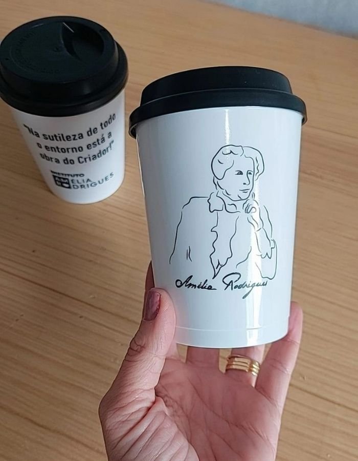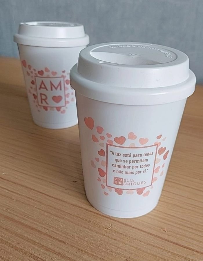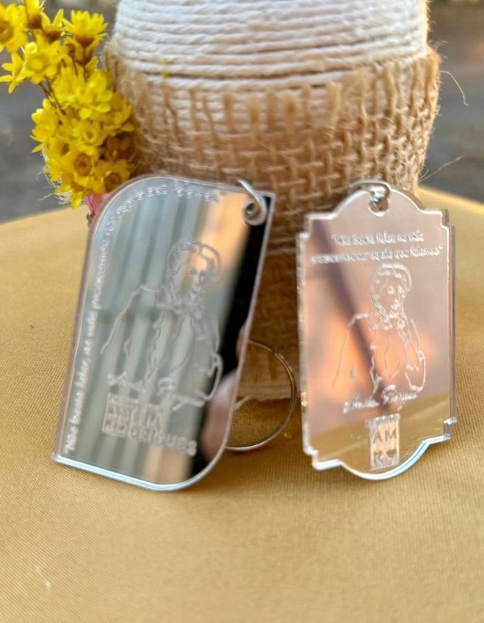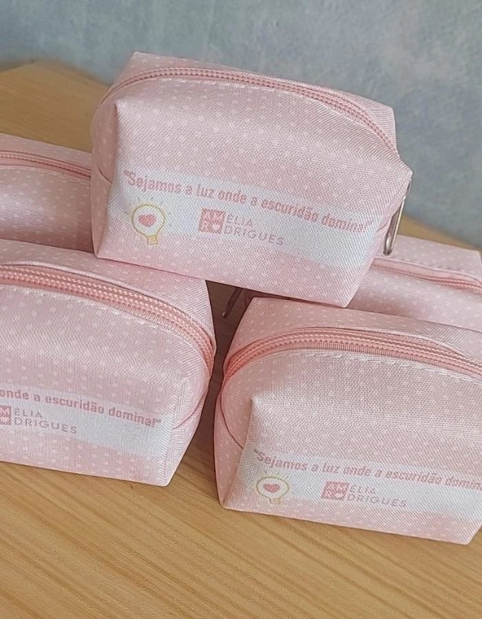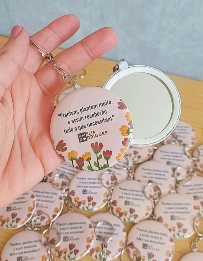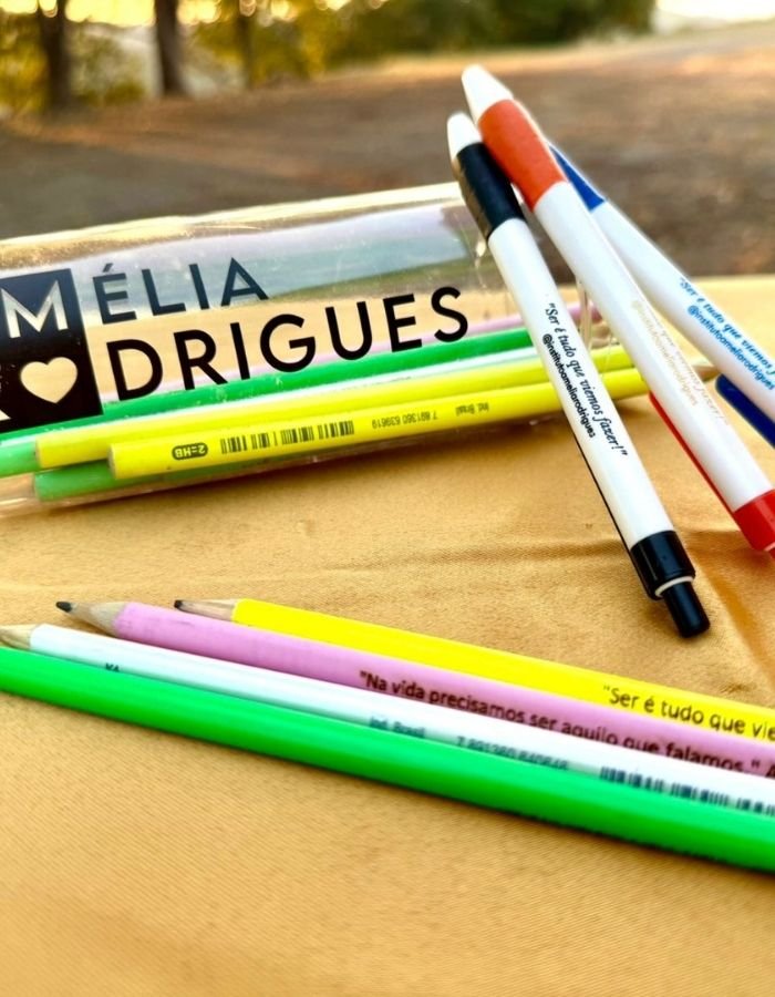 Canetas, Lápis, Latinhas com mensagens de Amélia Rodrigues, Ecobags, Mochilinhas, Chaveiros, Copos, Canecas, dentre outros.